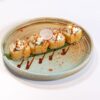 Hosomaki fritto con l’interno salmone sopra tartar di salmone, polvere di wasabi e salsa piccante e farina di tempura
